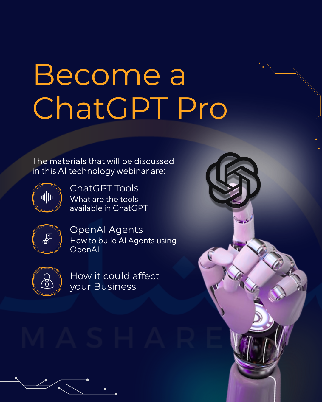 We are pleased to introduce our AI Technology Executive Webinar, a strategic session designed for senior professionals and decision-makers seeking to integrate artificial intelligence as a core organizational capability. The webinar provides an executive-level overview of advanced ChatGPT applications, the development of AI Agents using OpenAI technologies, and practical frameworks for deploying AI to enhance operational efficiency, strengthen data-driven decision-making, and accelerate sustainable digital transformation within their organizations.